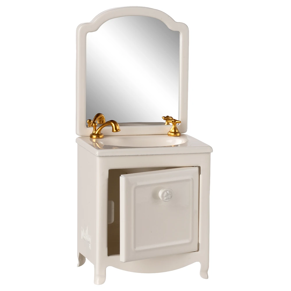 Skapa ett komplett badrum till Maileg's möss med denna badrumskommod i metall, med spegel, målad i en mjuk offwhite-ton med guldfärgad kran och vred. Kommoden har en öppningsbar lucka under handfatet för små förvaringsdetaljer och en spegel upptill som gör leken än mer verklighetstrogen.
