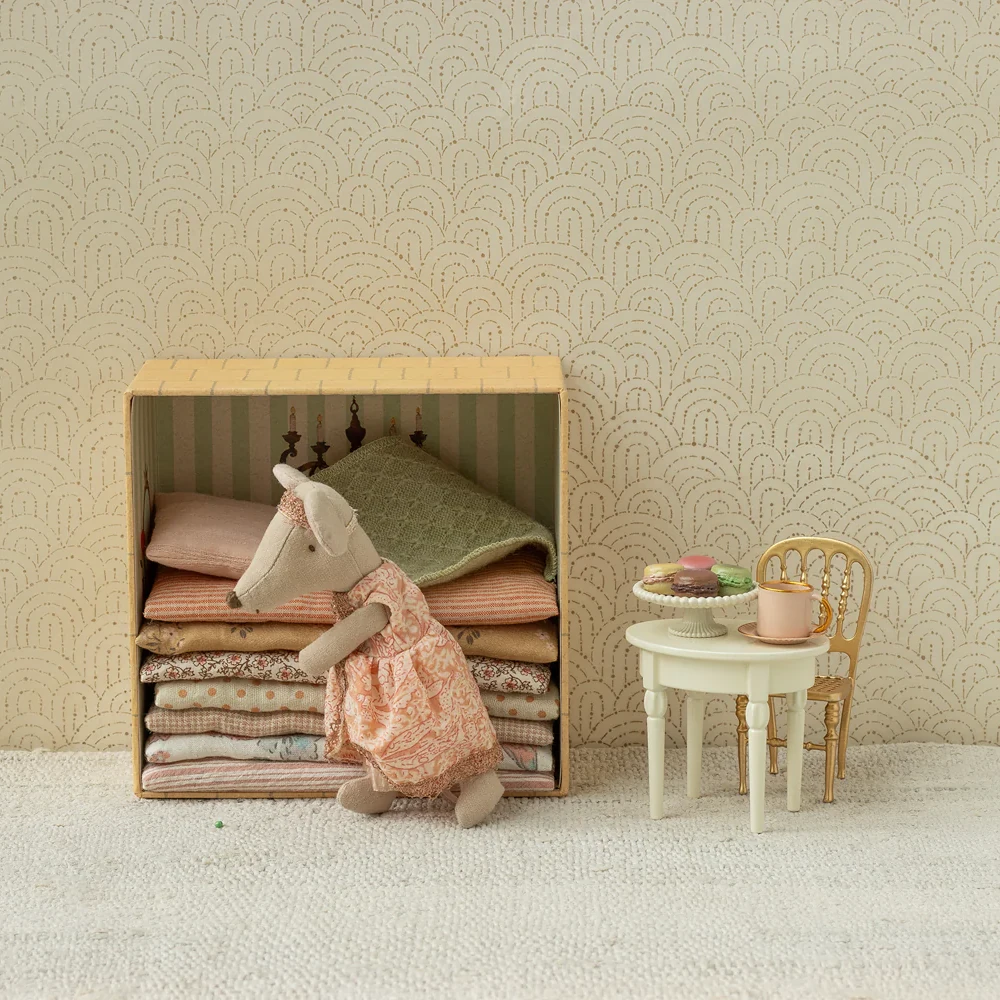 Ett charmigt sidobord i metall från Maileg, målad i en mjuk offwhite ton med vackra detaljerade ben som ger en klassisk och elegant känsla. Det mindre formatet gör bordet perfekt som avlastningsbord i Maileg's slott eller i mössens bondgård, där det kan användas till små dekorationer, lampor eller servering. Ett stilrent och tidlöst tillskott till mössens boende sompassar fint ihop med matbordet i samma serie.