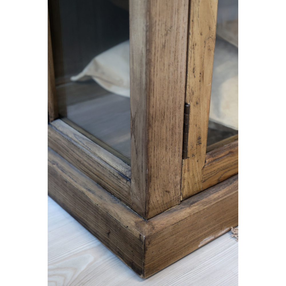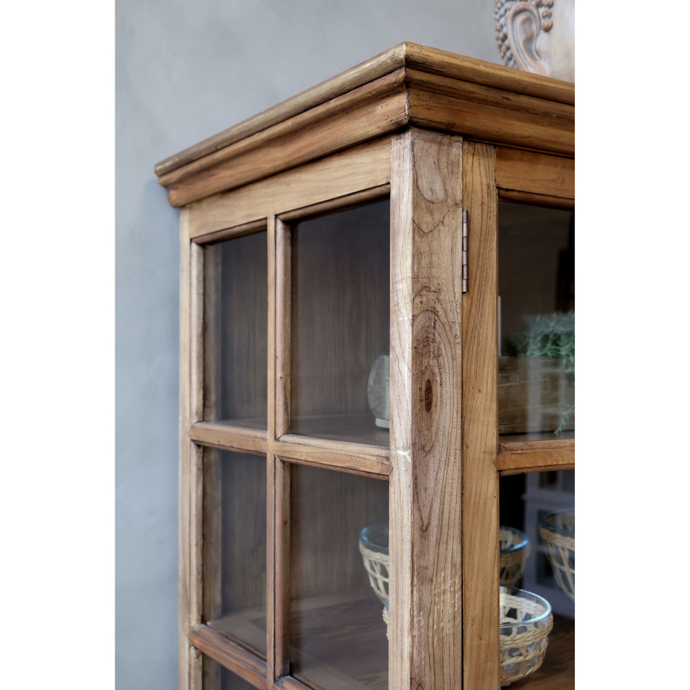 Beautiful, large, double glass cabinet in recycled wood with four glass doors both up and down so a total of eight doors, the upper part and the lower part have separated doors. Rustic and French, rural charm.