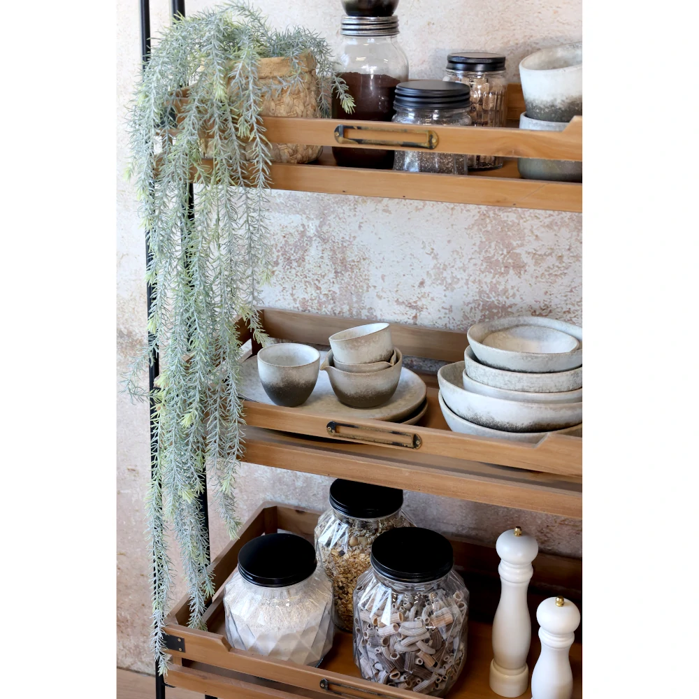 Rustic and industrial wall shelf with black metal frame and four shelves in the form of wooden bins. The sloping design gives a modern expression, while the combination of metal and wood creates a warm and timeless feeling. Perfect for storing and displaying books, decorations, kitchen gadgets or plants. Fits equally well in the kitchen as in the living room, hall or greenhouse.