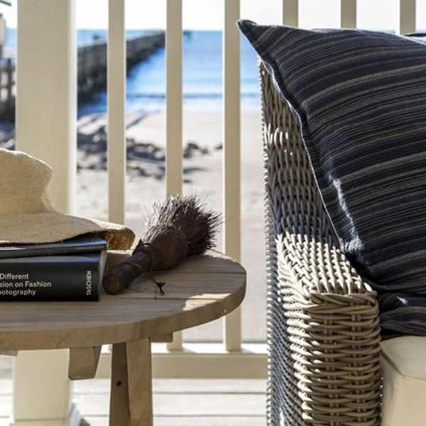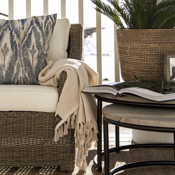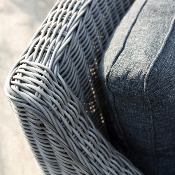 3-seater sofa in all weather wicker with aluminum frame and natural white pillows.