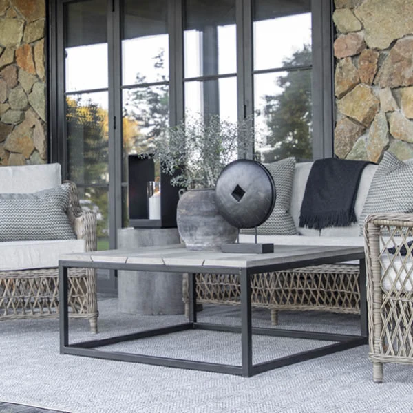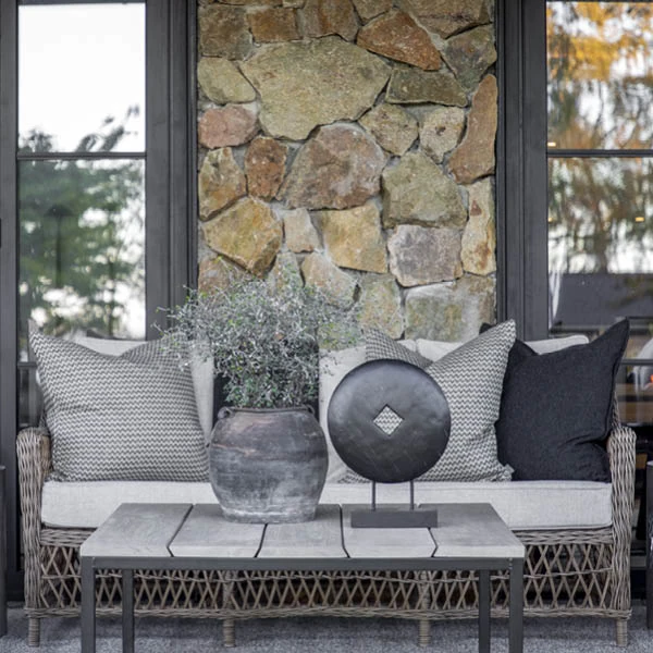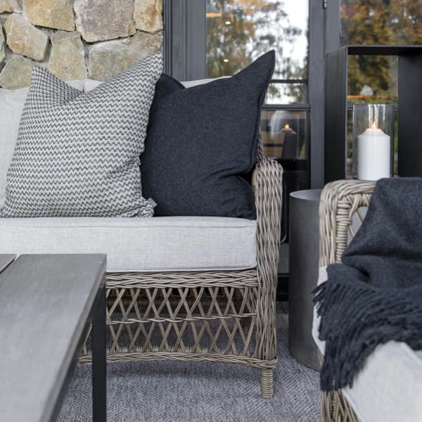 Stylish 3-seat sofa in all weather wicker with aluminum frame, including cushions as shown.