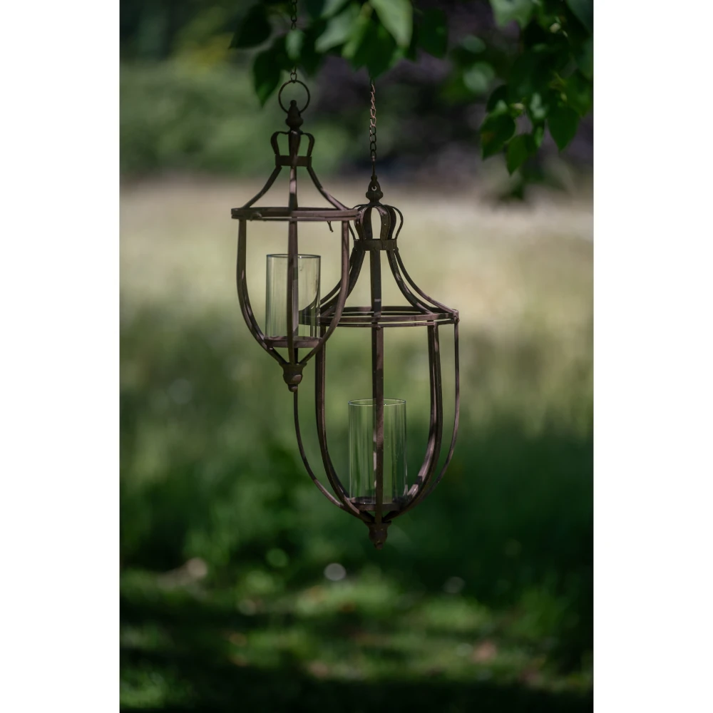 Hanging lanterns in rusty metal with glass cylinder. Available in two sizes, sold separately.