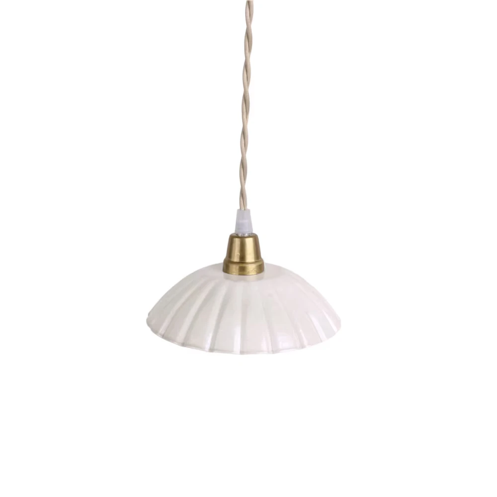 This beautiful ceiling lamp from Strömshaga is made of white painted sheet metal with a classic pleated shade and natural-colored twisted textile cord. The cord is approximately 150 cm long and is delivered without a switch or crown plug, which gives you the freedom to choose the connection as needed.