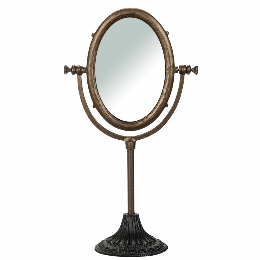Stylish mirror on a metal foot with a combination of black and antique brass that gives a raw and industrial feel. The robust design makes the mirror work just as well as a practical everyday mirror as a decorative detail in the home. Perfect to place on the dresser, in the hall or on the desk for a touch of modern vintage.