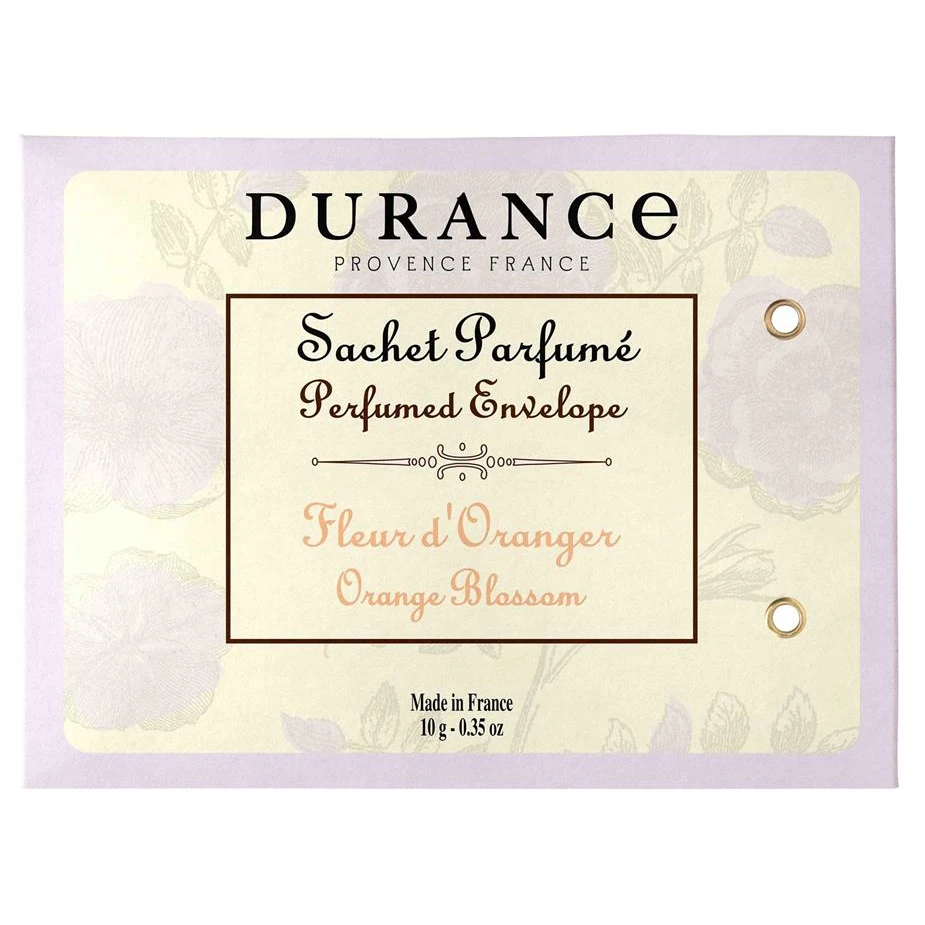 Sprid en fräsch och solig doft i ditt hem med doftpåsen Apelsinblomma från Durance. Perfekt för små utrymmen som garderober, byrålådor, resväskor, bilen eller till och med dammsugaren. Den eleganta påsen i elfenbensfärgat papper, dekorerad med en subtil blomfris, är både praktisk och vacker att se på.