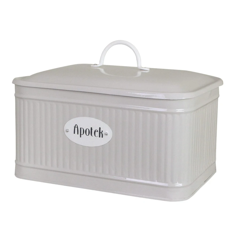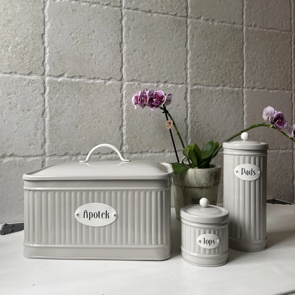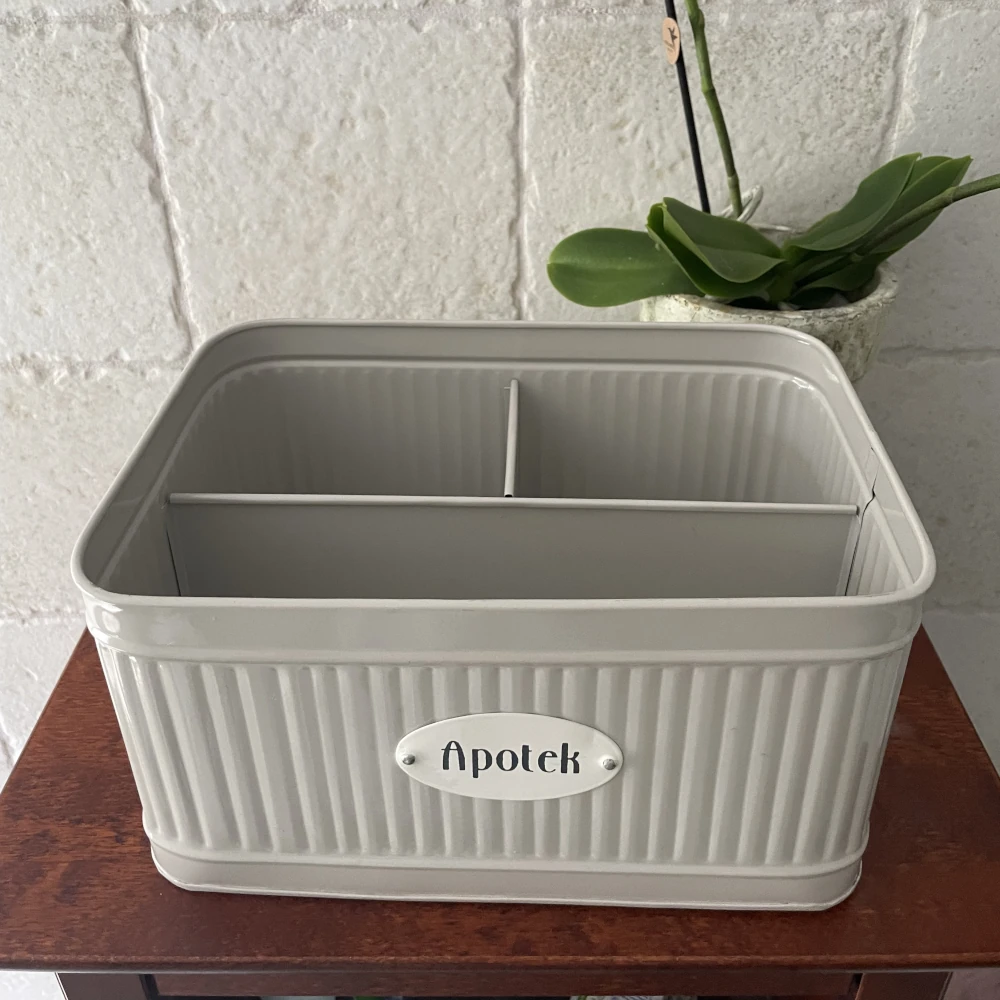 Plåtburken Hugo Apotek i lantlig stil är en dekorativ och praktisk förvaringslösning för ditt hem. Den är tillverkad i beige metall med en vacker vit skylt märkt “Apotek” på framsidan, vilket ger en nostalgisk känsla av gammaldags apotek och lantlig inredning. Lock med vitt handtag gör den enkel att öppna, och inuti finns tre fack som hjälper dig att hålla småsaker organiserade – perfekt för exempelvis mediciner, förbandsmaterial eller andra småprylar. En stilfull och funktionell detalj i badrummet, köket eller hallen..