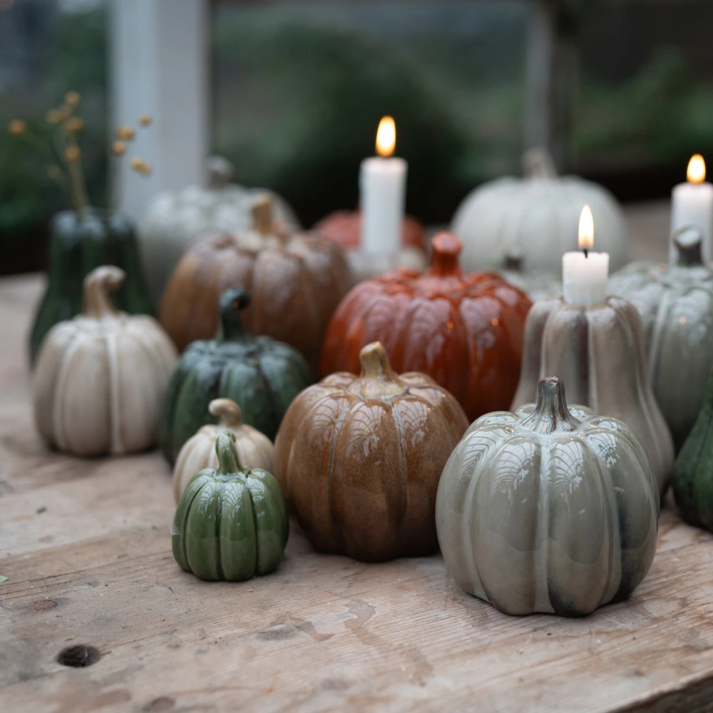 Dekorativa mini-pumpor Judy i orangemelerat porslin från Wikholm Form – perfekta för höstens dekorationer och dukningar. Setet består av två former: en mjukt päronformad och en rundare variant. Den vackra orangemelerade glasyren ger pumporna ett varmt, levande uttryck som passar fint i stilleben, på bordet eller bland annan höstinredning.