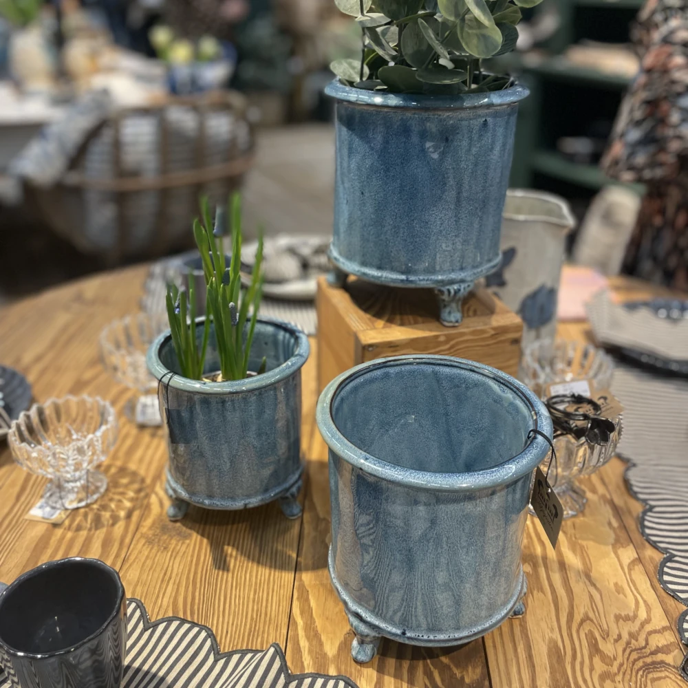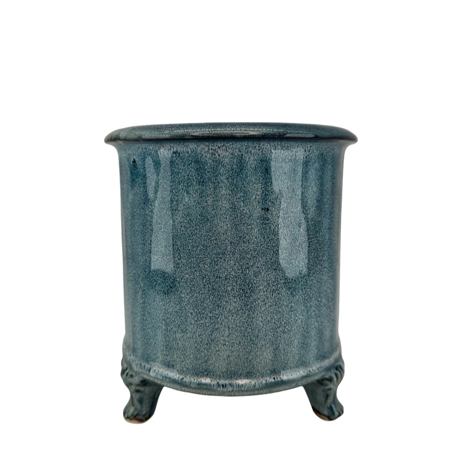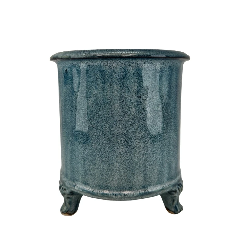 En vacker blå glaserad kruka som vilar på fyra dekorativa tassar – en elegant detalj som ger både höjd och karaktär åt din växt.
