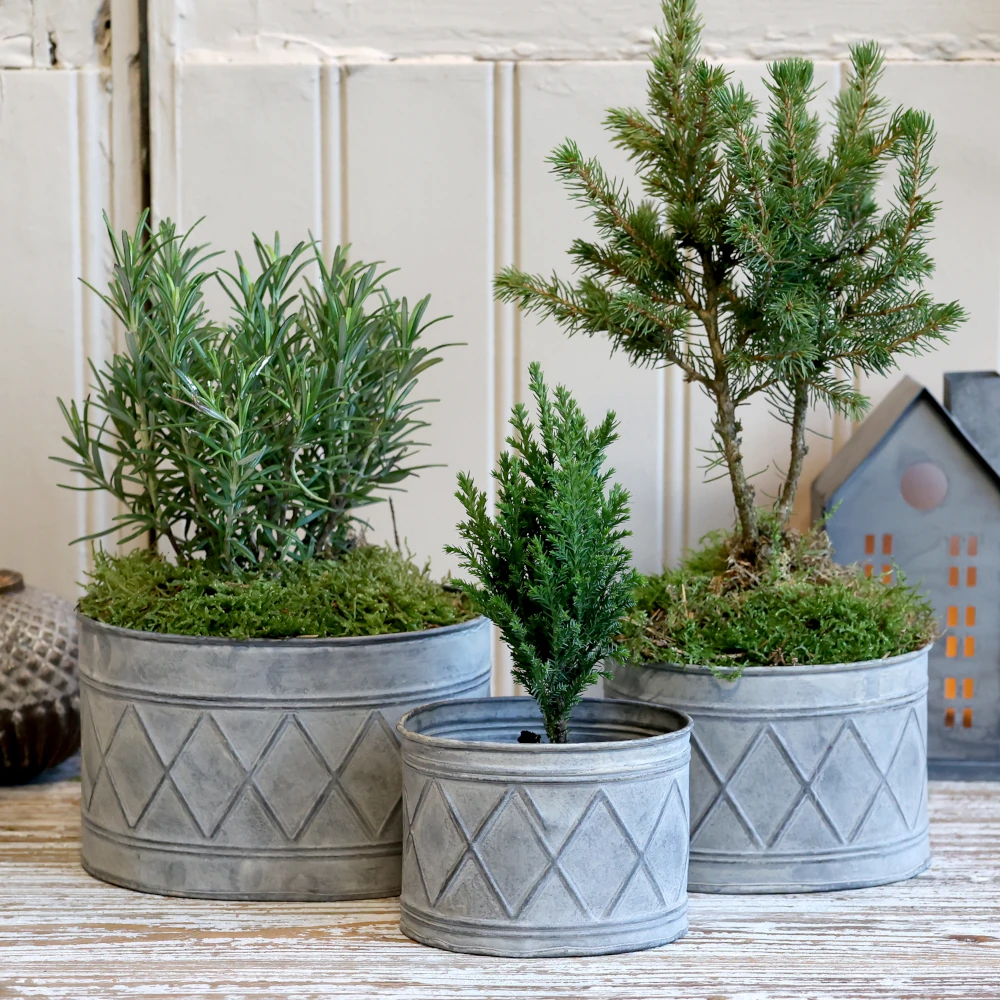 Ge hemmet en stilfull och lekfull touch med detta set om 3 krukor Harlekin från Chic Antique. Krukorna är tillverkade i antik zink och har ett präglat harlekinmönster på utsidan som liknar små trummor, vilket ger en rustik och charmig vintagekänsla.
