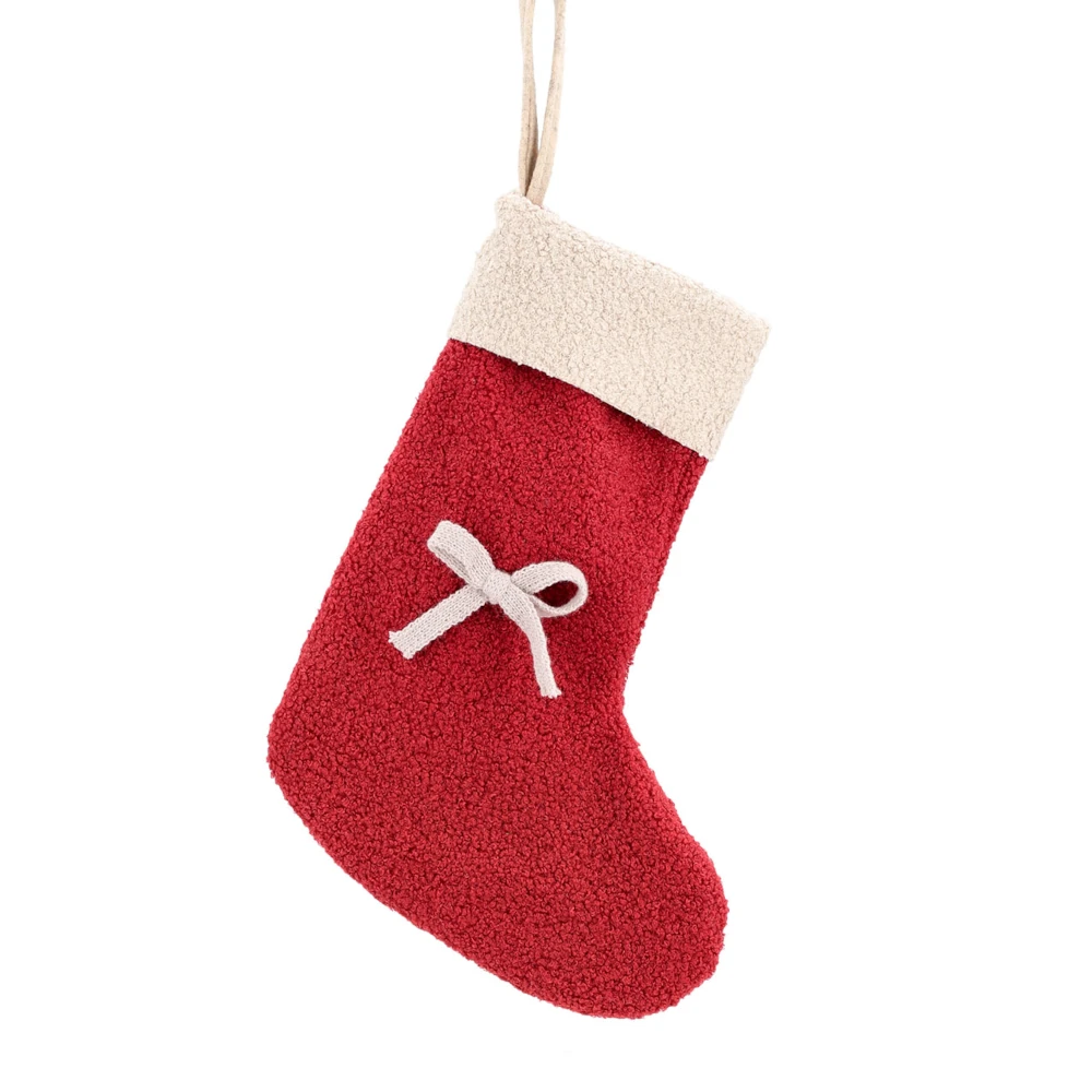 Låt julkänslan flytta in med denna mjuka och charmiga julstrumpa från A Lot Decoration. Strumpan är tillverkad i rött och naturvitt teddytyg som ger en gosig och hemtrevlig känsla, och pryds av en söt liten rosett tillsammans med en praktisk hängare.