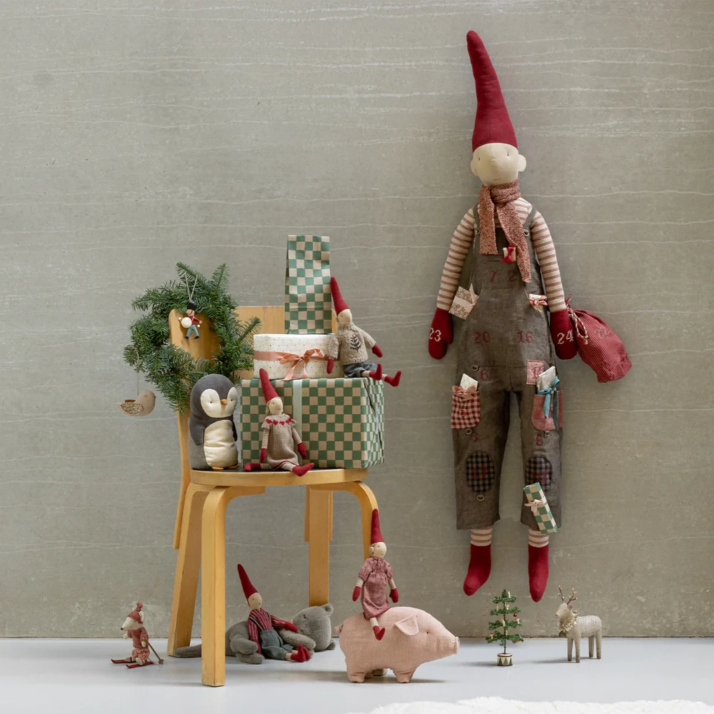 Möt Tomte Pixyflicka No.2 Karamella, en av Mailegs charmiga storlek-2-pixies med varm och vänlig julglans. Hon bär en mjuk rödmelerad klänning som dansar lätt när hon rör sig, och hennes blonda hår är uppsatt i två små knutar som ger henne ett extra lekfullt uttryck.