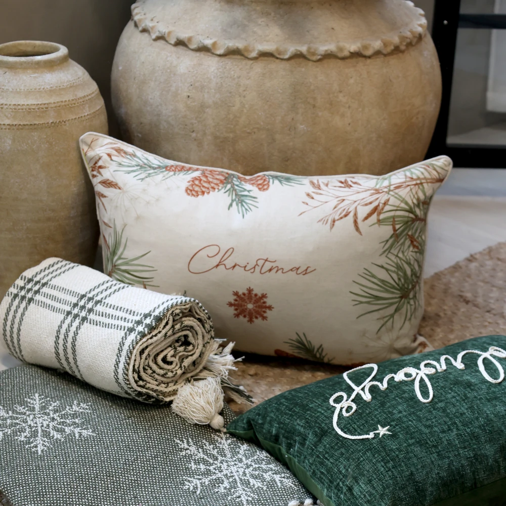 Skapa en varm och stämningsfull känsla hemma med kuddfodralet Aix Christmas från Chic Antique. Kuddfodralet är tillverkat i linfärgad textil och pryds av vackra grankvistar, kottar och texten Christmas i rost- och grön nyans – en naturlig och elegant juldesign som förmedlar lugn och tradition.