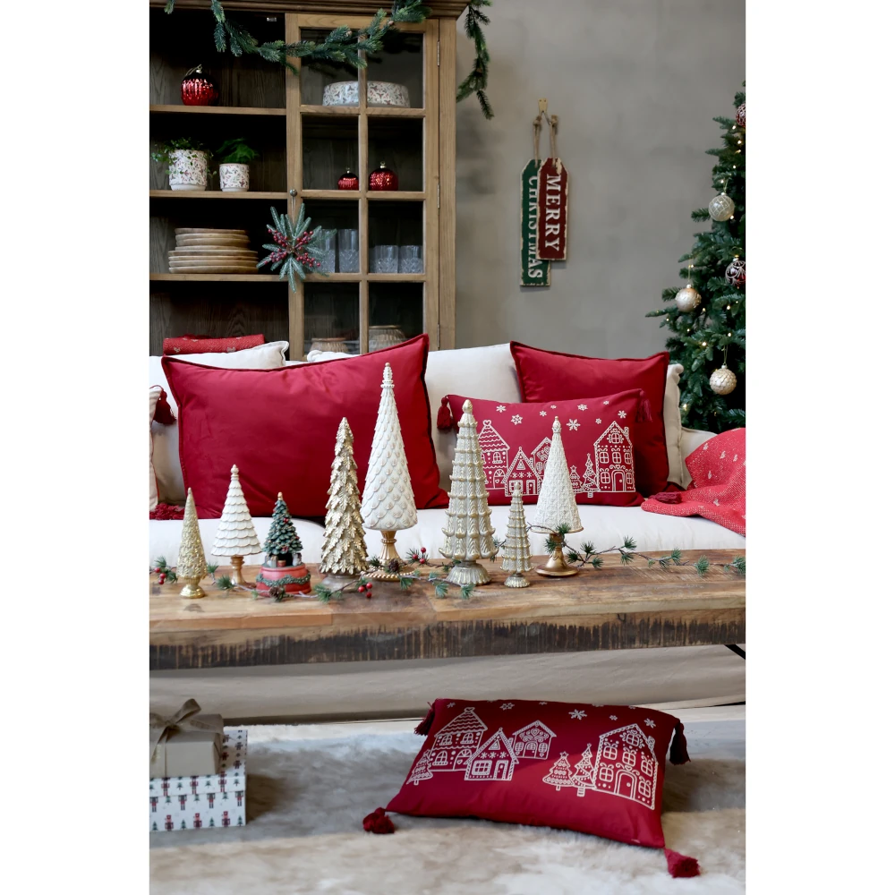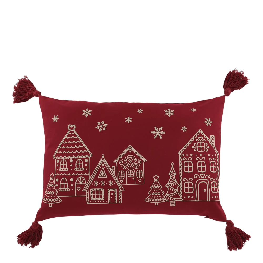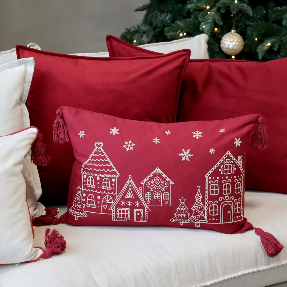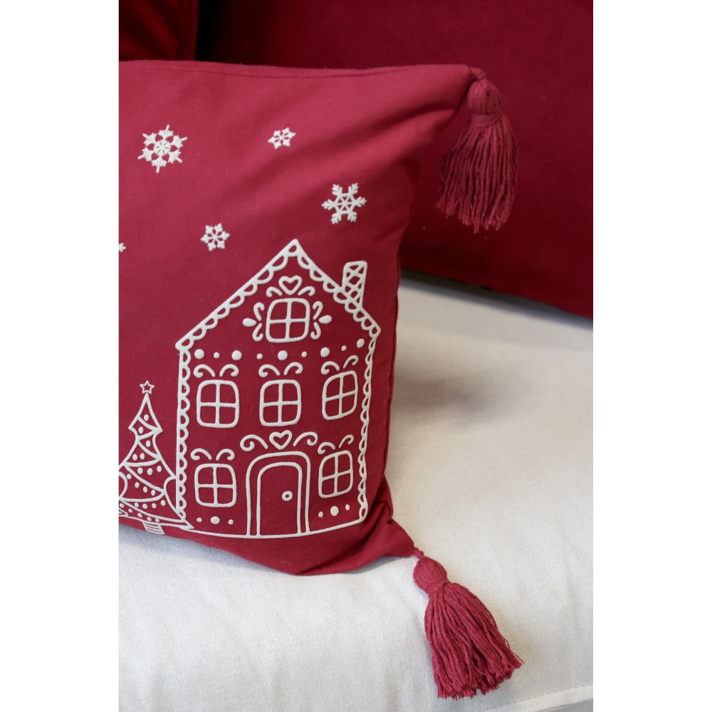 Skapa julmys i soffan eller fåtöljen med kuddfodralet Aix Hus från Chic Antique. Det vackra röda fodralet pryds av hus, granar och snöflingor i vitt, vilket ger ett härligt vintrigt uttryck. De röda tofsarna i hörnen ger en charmig och exklusiv detalj som fulländar helhetsintrycket.