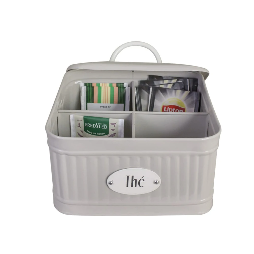 Plåtburken Hugo Thé i beige är en vacker och funktionell förvaringsburk i lantlig stil – perfekt för att organisera dina favorit-teer. Framtill pryds burken av en vit skylt med texten “Thé”, vilket skapar en nostalgisk känsla av gammaldags kök. Invändigt finns fyra fack som gör det enkelt att sortera olika tesorter eller tepåsar. Locket, med vitt handtag, håller innehållet fräscht och burken blir samtidigt en dekorativ detalj i köket eller på tebordet. Matcha gärna med övriga produkter i Hugo-serien för en enhetlig stil.