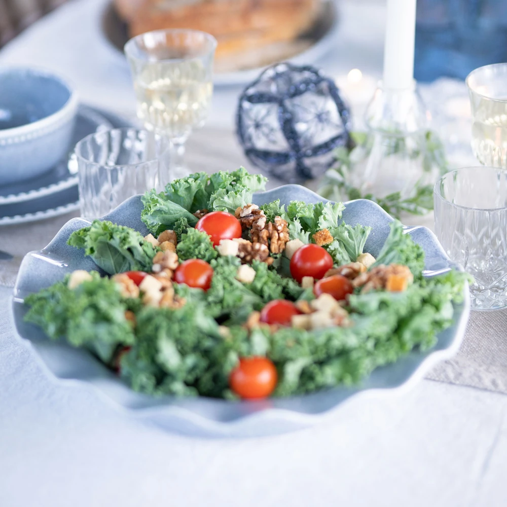 Skål Emmeline från A lot decoration är en stor skål eller ett djupt, större fat i stengods. Den havsblå färgen Ocean kombineras med en vågig kant som ger skålen ett mjukt och elegant uttryck.