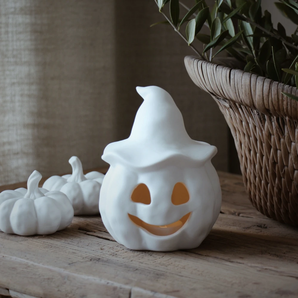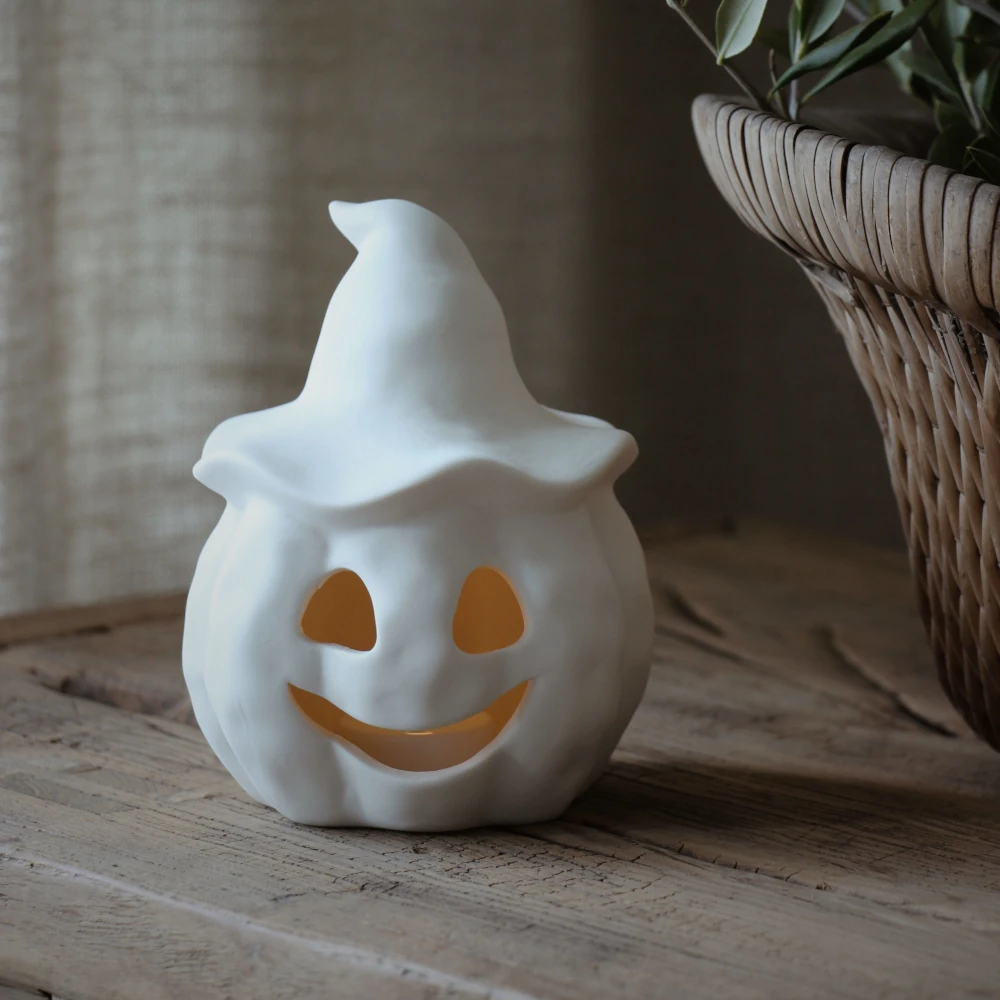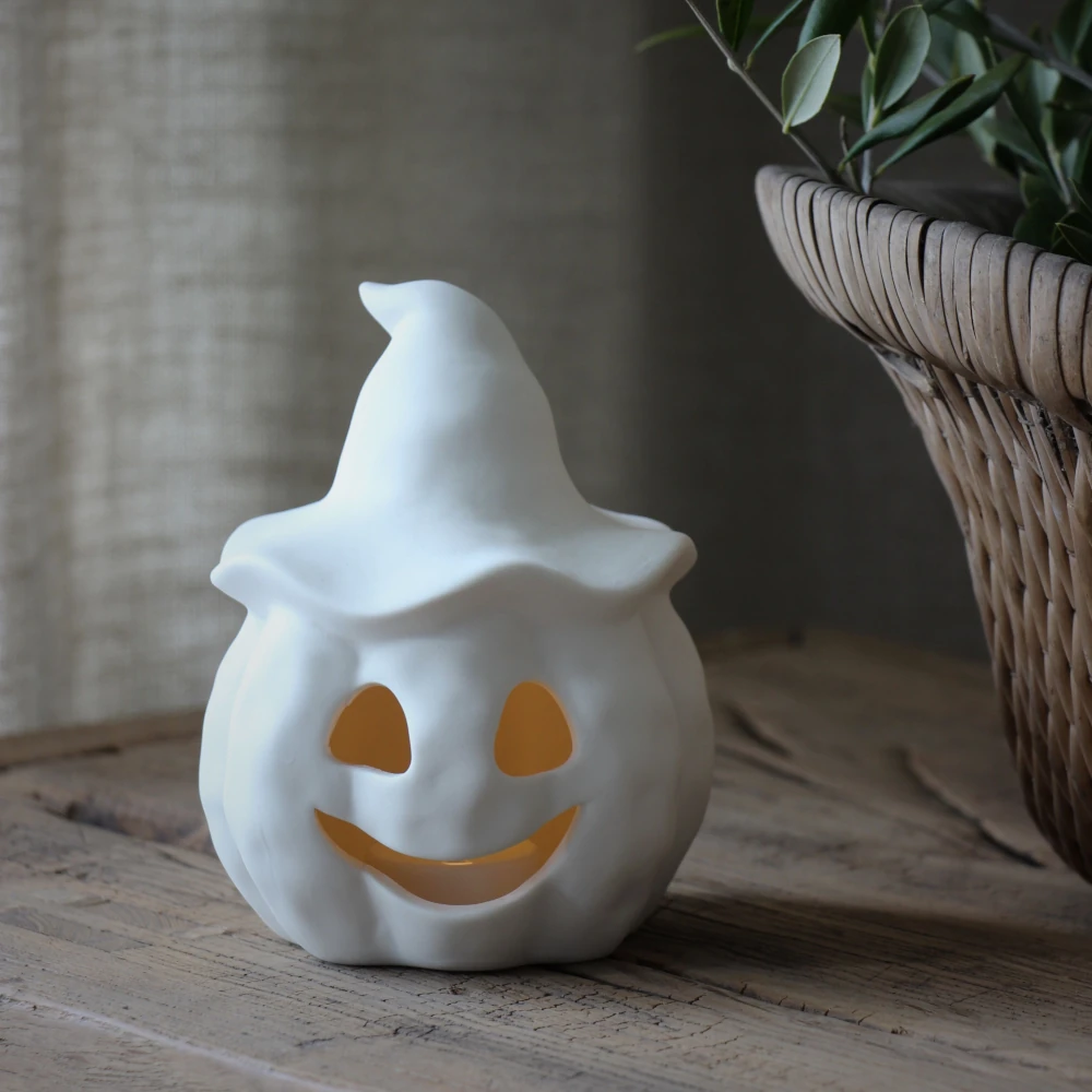 En charmig vit pumpalykta från Majas Cottage, med glad mun och ögon samt en hatt på toppen.