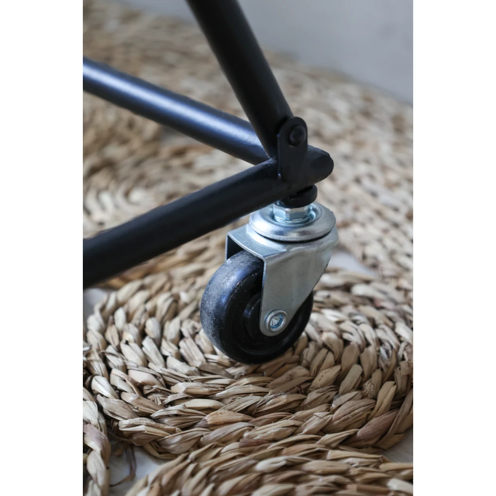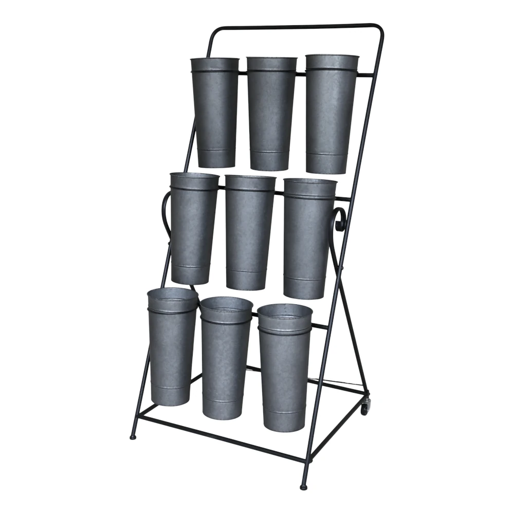 Praktisk och dekorativ blomställning i svart metall med nio höga, zinkfärgade blomhinkar. Perfekt för att arrangera blommor, växter eller örter på ett överskådligt och vackert sätt. Passar lika bra för hemmet, altanen eller som säsongsdekoration i butiker och caféer. Den stadiga konstruktionen och hjulen gör den enkel att flytta vid behov.