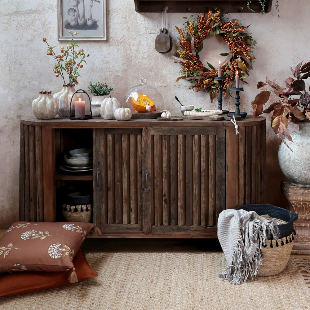 Grimaud är en rustik och själfull skänk tillverkad av vackert patinerat återvunnet trä. Varje möbel bär spår av sitt tidigare liv – märken, nyanser och naturliga skiftningar som ger värme, historia och en genuin känsla till ditt hem.