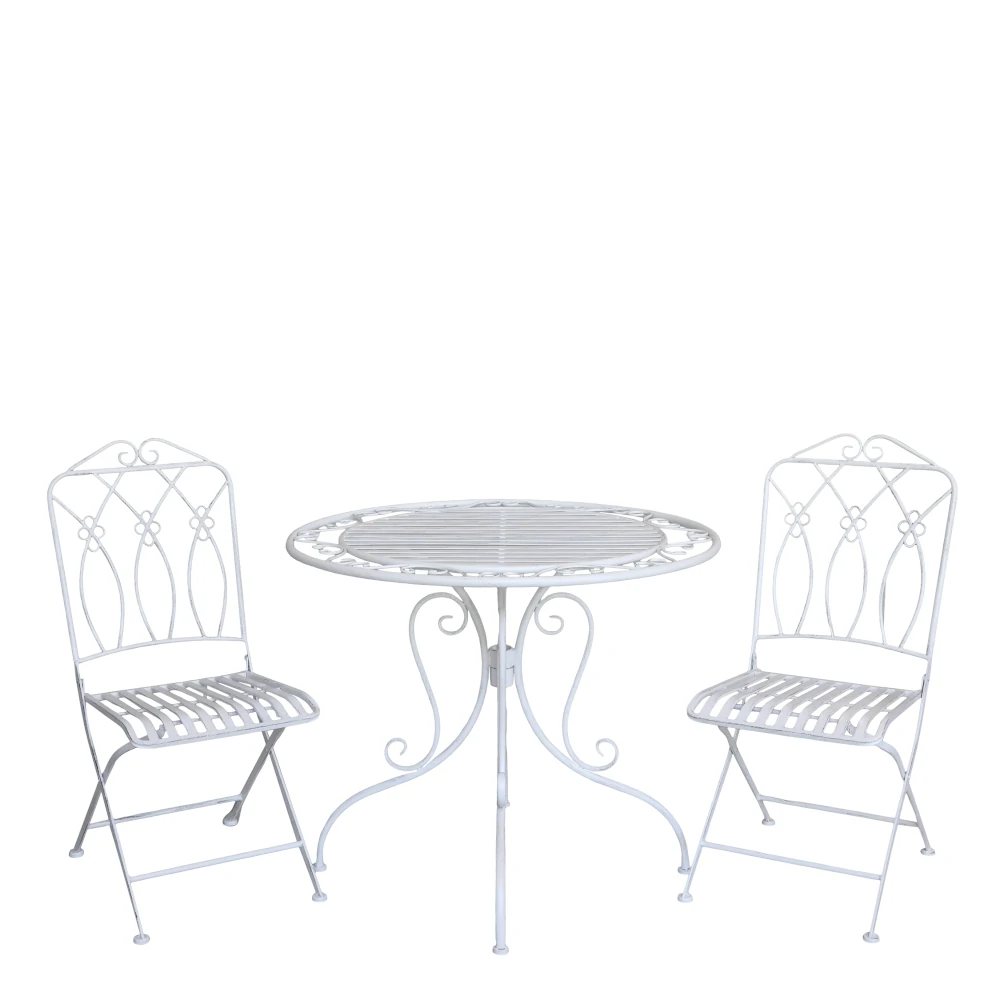 Underbart caféset i cremefärg, bestående av två stolar och ett bord, tillverkad i järn, i en romantisk stil som gör sig fint i trädgården.