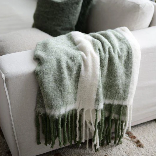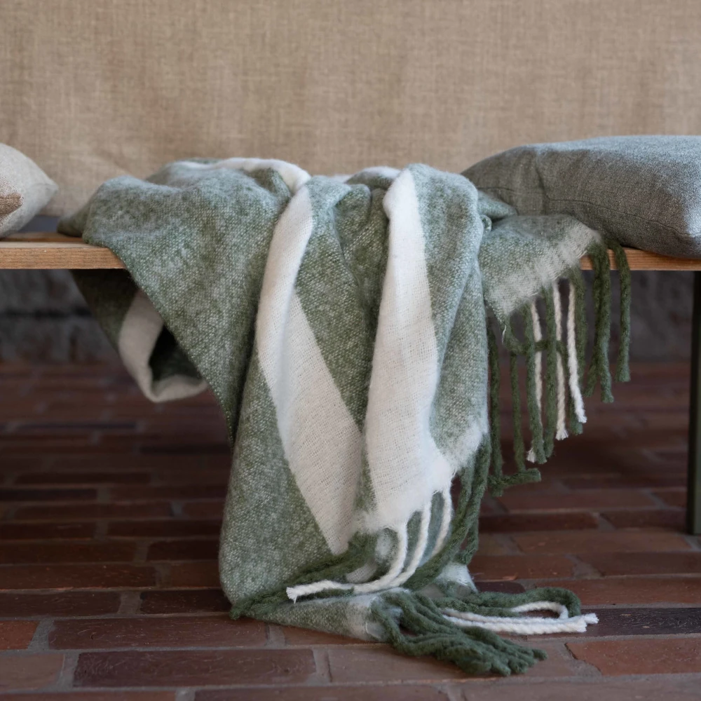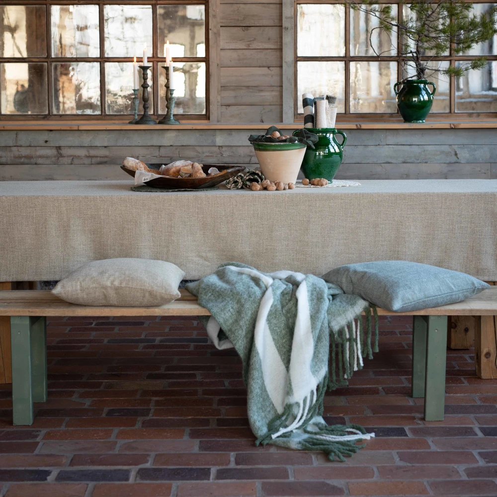 Pläden har breda ränder i harmoniska gröna toner och avslutas med tjocka tvinnade fransar längs kanterna. En detaljrik design som skapar både karaktär och mjukhet i hemmet.