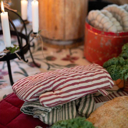 Skydda händerna med stil med Karin - en rödrandig grytvante i bomull från Fondaco. Den garnvävda randen ger en rustik och hemtrevlig känsla, perfekt för både lantliga och moderna kök.