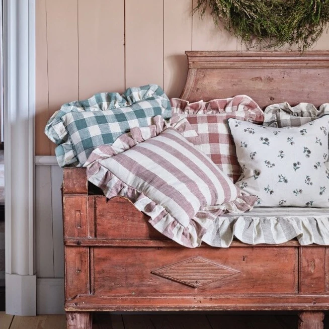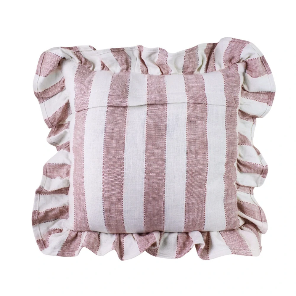 Kuddfodral i vitt med breda rosa ränder och volangkant runtom. Lantligt och romantiskt till din till din kökssoffa, sängen eller soffan, likväl som till sommarstugan på landet.
