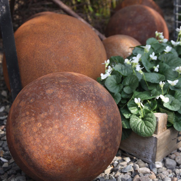 Rostigt klot till dekoration i din trädgård, balkong eller uteplats, rosten gör sig väldigt fint mot det gröna och alla vackra blommor, vissa ojämnheter kan förekomma.