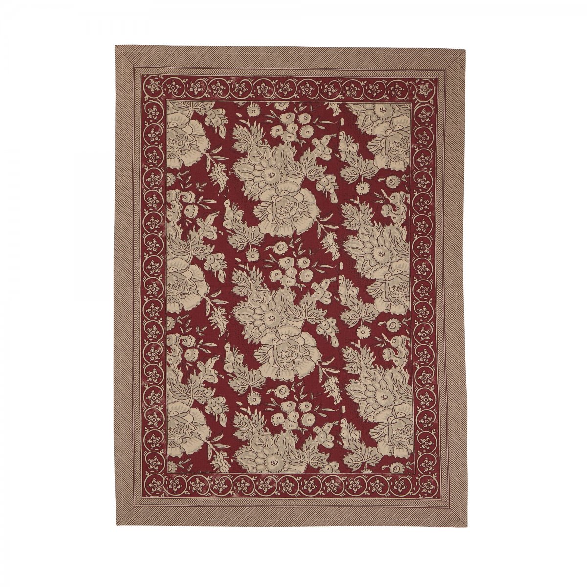 Lyft köket och dukningen med Sonia - en röd kökshandduk i 100% bomull från Fondaco. Handduken pryds av ett magnifikt mönster i djupt rött och beige som omges av en bård runtom, vilket ger en elegant och stilfull känsla.