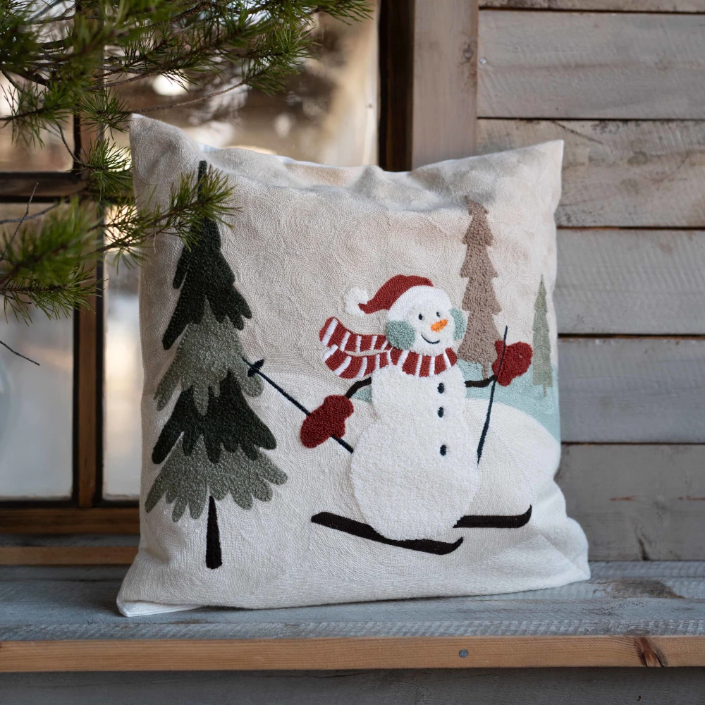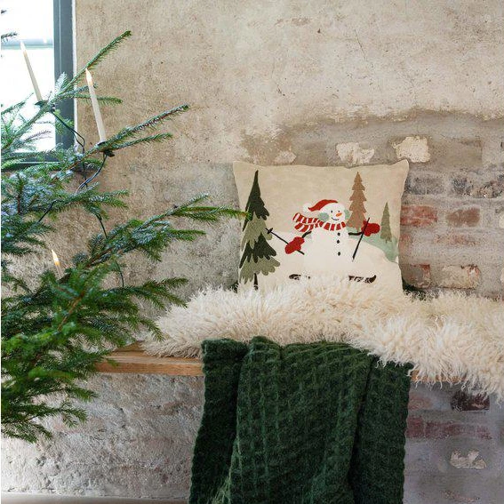 Kuddfodral med en broderad snögubbe i skidbacken - Från Fondaco