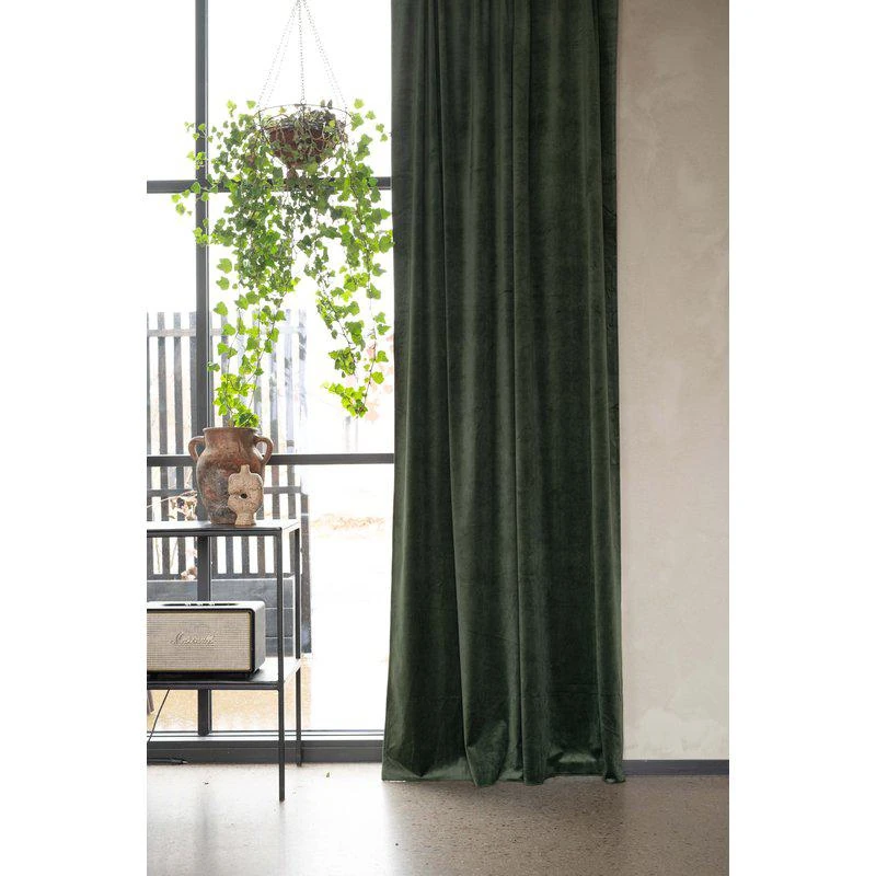 Multibandslängd Esther från Fondaco i en dovt mossgrön sammet som skapar en harmonisk och inbjudande känsla i hemmet. Sammetstyget har en lätt glans som förhöjer gardinernas uttryck och ger ett sofistikerat, tidlöst intryck. Tack vare tygets tyngd får gardinerna ett vackert, naturligt fall som bidrar till en ombonad och elegant atmosfär.