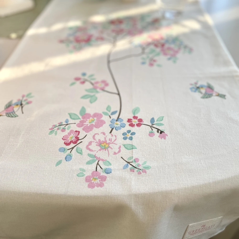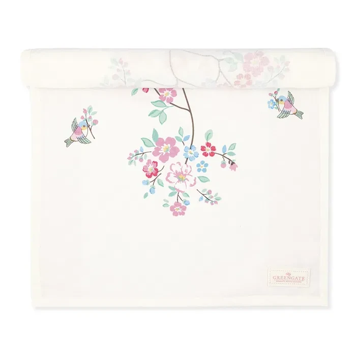 Desdemona Vit löpare från GreenGate är en ljuvlig dukningsdetalj med ett konstnärligt blomprint i rosa, blå och turkosa toner. Designen talar för sig själv – ett mjukt, drömskt mönster som ger bordet en levande men harmonisk känsla.