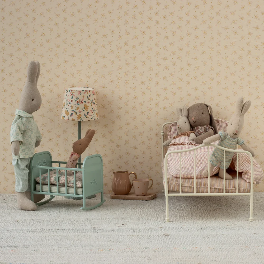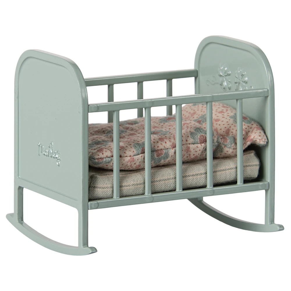 En underbar vagga i metall från Maileg, designad i mintblå med fina detaljer och blomprägling på huvudgaveln. Vaggan står på rundade ben, vilket gör att de små Maileg-vännerna kan vaggas försiktigt till sömns.